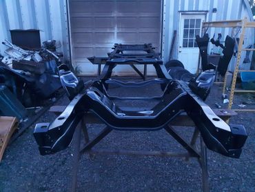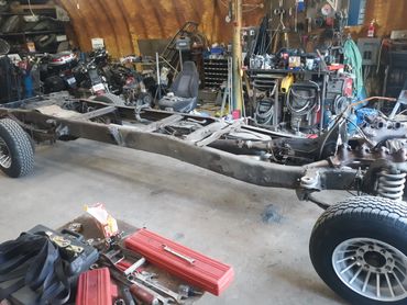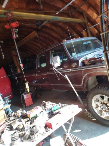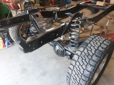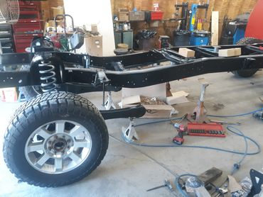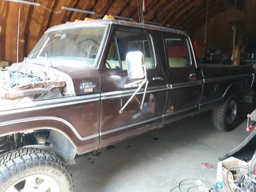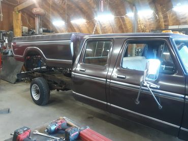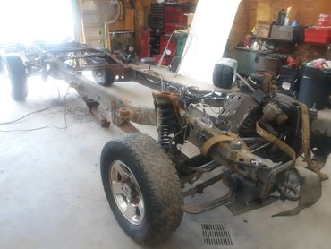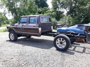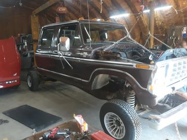 This 1979 F350 Ranger started as a 2wd 4 door. We pulled the engine and then removed the bed and cab. Once the original '79 frame was stripped of all suspension and drive train, it was sent to be sand blasted. We used a 2006 Super Duty frame as a donor for the 4wd suspension and axles. The 79 frame was coated with Chassis Saver Frame paint before being reassembled. A new crate 460 engine and fresh c4 transmission were installed. The 79 frame and 06 suspension were kept as stock as possible to allow for off the shelf parts. The before and after shots really show the transformation.